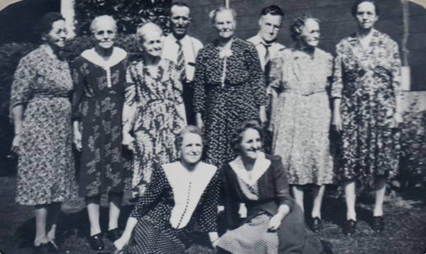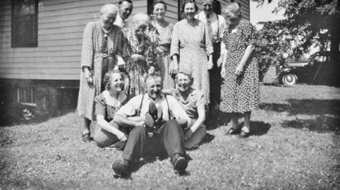 S-063 - Schneider Family – 1940’s Back Row: Annie Walter, Mary Walter, Lizzie (Elizabeth) Hersch, John Schneider, Ricky (Rachel) Walter, Edward Schneider, Maggie (Margaret) Melvin, Adeline Walter. Seated: Ida Kaiser, Clara Ruppel